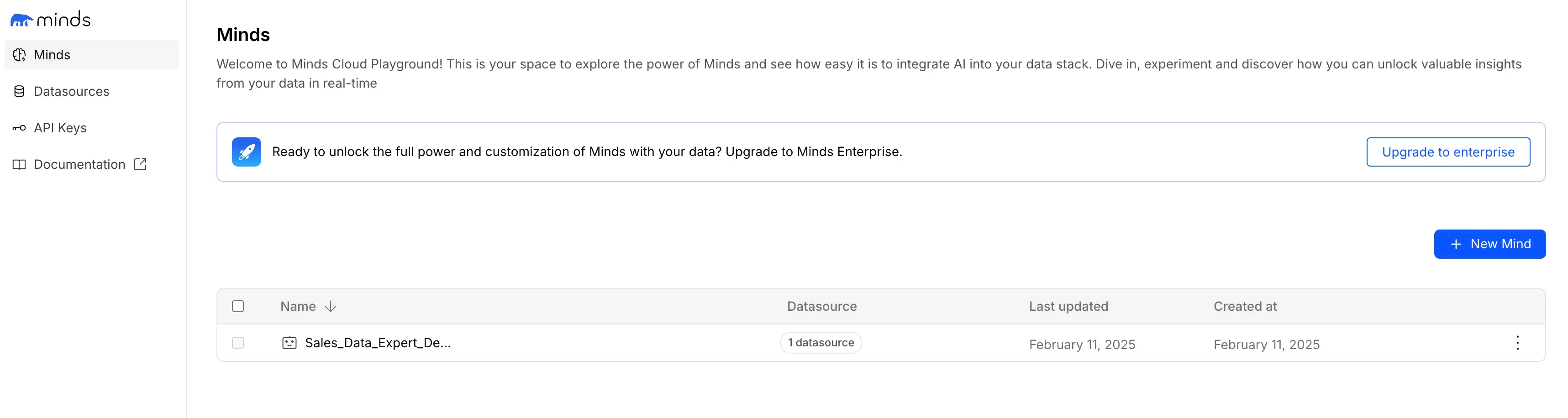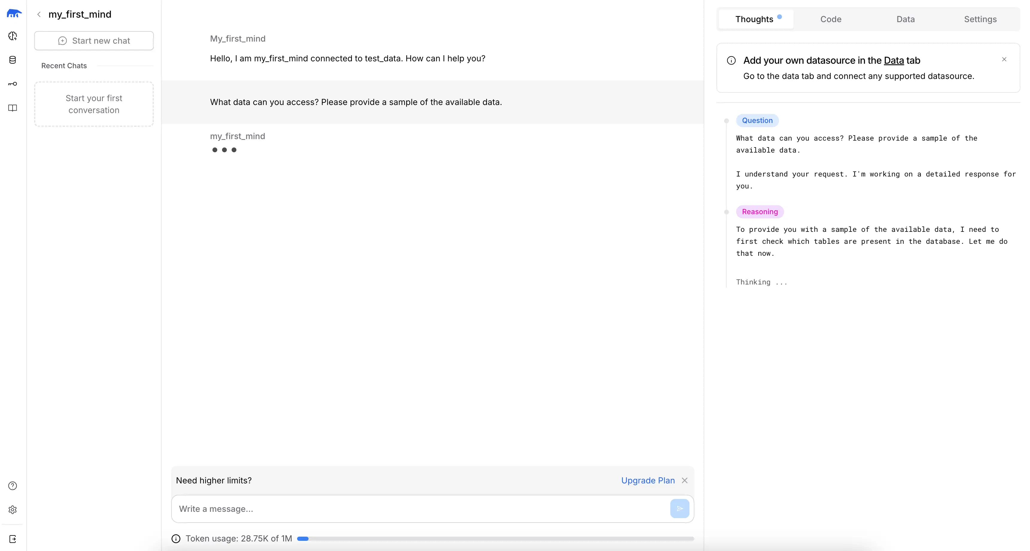 When you enter a Mind, you’ll see the chat interface where you can interact with the Mind and observe its thought process as it works through your queries.